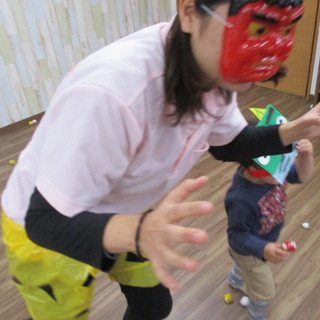 その瞬間、保育室は、「ワーワーギャーギャー」。子ども達は、慌てふためき、「鬼は外~~」所では、なくなりました😣😣😣