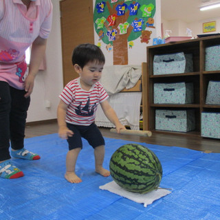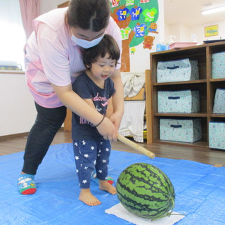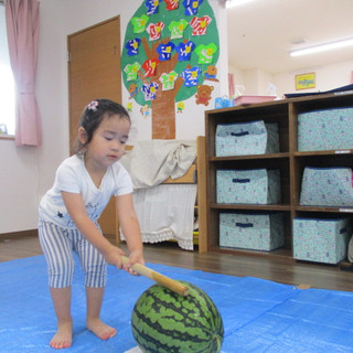 うさぎ組のお友だちは「そーれっ!」という掛け声ですいかを叩いていましたよ⭐