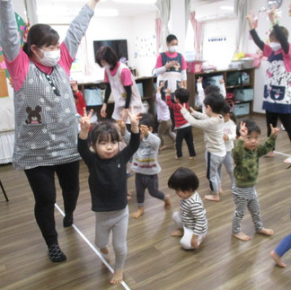 お別れ会の後は、リズムあそびとオオカミさんゲームをしました⭐リズムあそびでは、ピアノの音に合わせて色々な動物になりきって楽しみましたよ😆オオカミさんでは、オオカミがどんどん支度していく姿にドキドキの子どもたち😂オオカミさんが食べに来ると泣いてしまう子どもたちでしたが、最後はうさぎ組のお友だちがじゃんけんをしてバツのマークをオオカミさんに貼って退治してくれましたよ✨