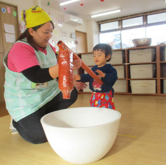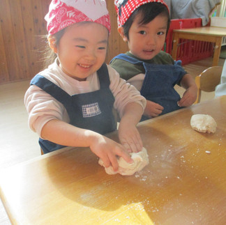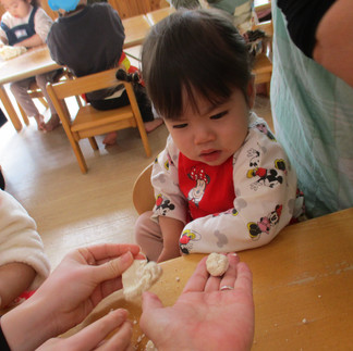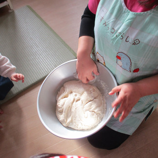 次は、おもちに見立てた小麦粉粘土を触ってみました😊