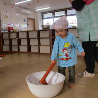 小さなお友達から順番におもちに見立てたタオルを杵で『ペッタン!ペッタン!』とついてくれましたよ(*^^*)✨