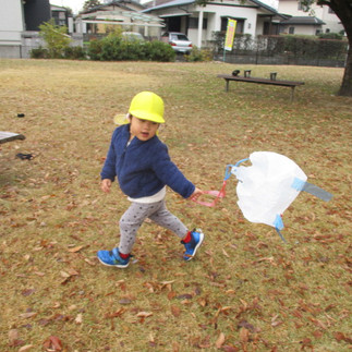 りす組さんとうさぎ組さんは、ビニール袋にカラーペンでお絵描きしたりシールを貼って可愛い凧が出来上がっていました⭐公園で,先生から凧揚げのやり方を聞いてたくさん走って高く凧を揚げていましたよ😊「先生みてみて~」と凧が揚がっているのを嬉しそうに教えてくれましたよ~✨