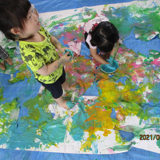 小さいお友だちも手も足も絵の具の色にどんどん染まって行きました。 とっても楽しんで遊んでいましたよ(^^♪ さて、今日の大きいお友だちのハッスル度は前回のを踏まえた上でバージョンアップしていましたよ❕